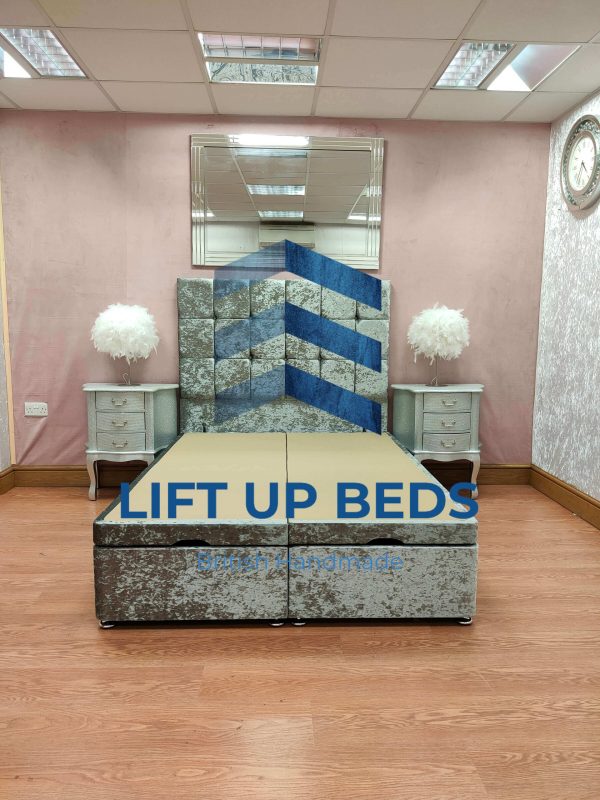 Solid divan bed providing maximum storage functionality with end lift, right hand or left hand side lift up options.