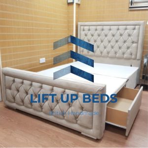The New York Ottoman Storage Divan Bed. Deep padded with a 54″ high headboard design to fit in with any bedroom.